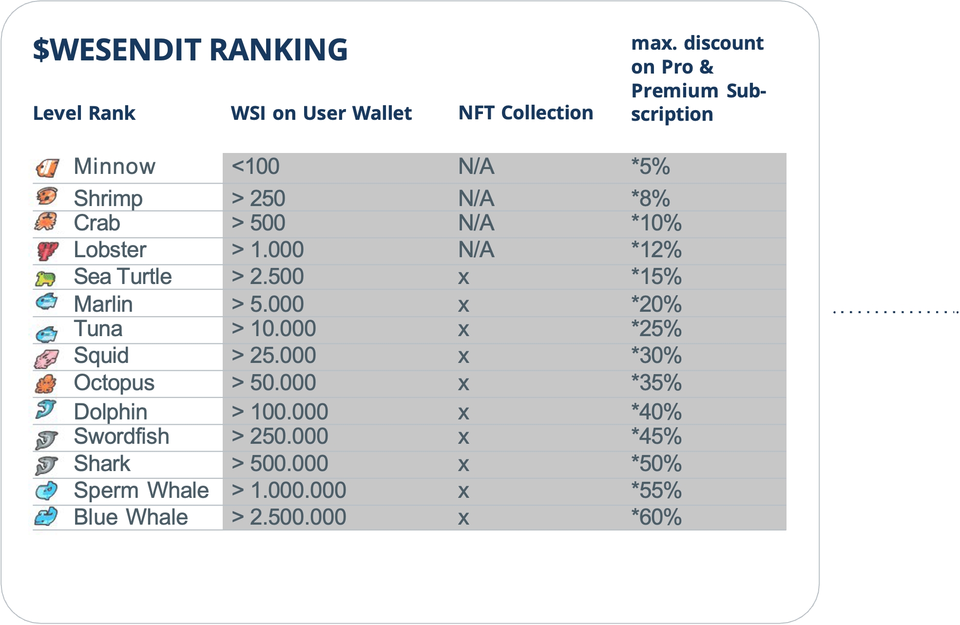 Durch den Besitz von WSI-Tokens können Nutzer in Rangstufen aufsteigen, was ihnen Rabatte und exklusiven Zugang zu NFT-Kollektionen verschafft. Mit zunehmender Anzahl an gehaltenen WSI-Tokens steigt auch der Rang eines Nutzers, von "Minnow" mit 0% Rabatt bis hin zu "Blue Whale" mit einem maximalen Rabatt von 60% auf alle Basic, Pro und Business Subscription, siehe: https://www.wesendit.com/web3-ranks